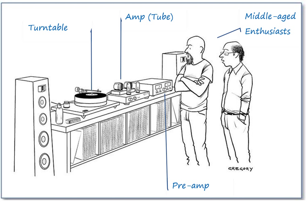 There are four obvious components to this system (speakers, amplifier, pre-amplifier, and turntable), and one component that I continually see ignored in “audiophile” discussions. That component is the hearing quality of the listener.